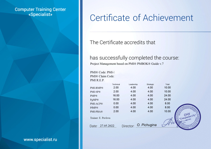 Успешное окончание курса Управление проектами на основе стандарта PMI® PMBOK® Guide v.8