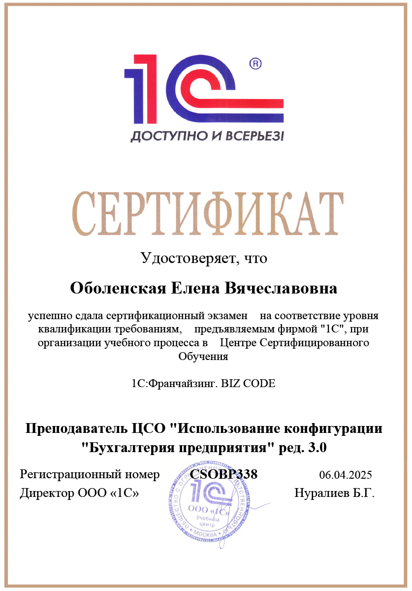 Имеет сертификаты 1C:Профессионал, 1С:ERP, 1С:Документооборот, 1C:ЗУП, 1С:Руководитель проектов. Владеет MS Office, программами 1С:Предприятие: 1С:Бухгалтерия, 1С:УНФ, 1С:УПП, 1С:ЗУП, 1С:ERP, интерфейсным механизмом 1С – графические схемы. Проходила повышение квалификации по программам менеджмента управления персоналом. Лауреат Профессионального форума "Лидеры дела" в номинации "Информационные технологии в управлении и корпоративное обучение", Торгово-Промышленная Палата Российской Федерации, декабрь 2024.
