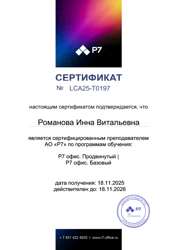 Романова Инна Витальевна - отличный преподаватель, давала интересный материал, понятно объясняла, помогала в сложных моментах, была открыта и готова отвечать на любые вопросы по почте в неурочное время по-домашнему заданию, в аудитории была непринужденная и дружеская атмосфера.